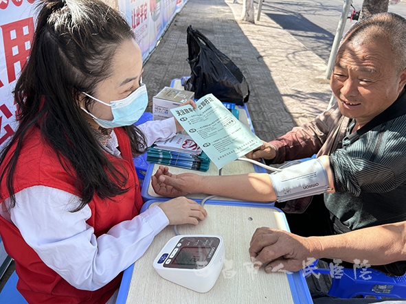 义诊现场,红手环志愿者服务团设立健康咨询台,悬挂横幅,发放卒中宣传单,卒中宣传手册。医护人员为前来就诊的群众们免费测量血压,并针对他们的问题一对一耐心解答。