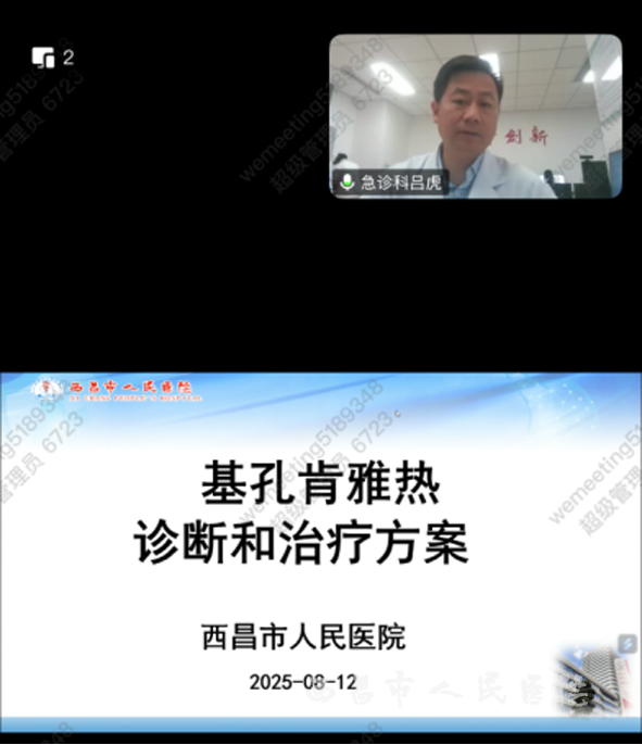 为提升西昌市人民医院医务人员对基孔肯雅热的诊疗能力,规范诊疗流程,保障患者就医安全,我院于2025年8月12日,通过腾讯会议举办了基孔肯雅热诊疗方案线上培训会,让全院医护人员提高对该病的早期识别和规范处置能力。