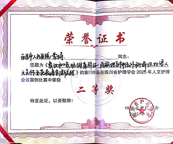 近日,四川省护理学会2025年人文护理会议在成都成功召开,西昌市人民医院神经外科护士长李娟带领护理团队受邀参加会议,并在会议案例比赛中脱颖而出,荣获二等奖,展示了我院彝汉双语护理人文关怀示范病房创新实践成果。