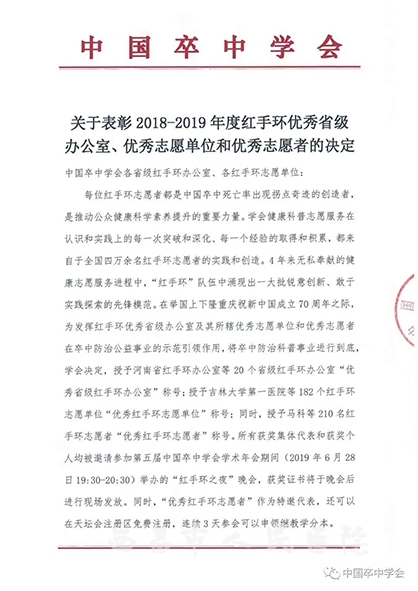 中国卒中学会官网上评价:这次受到表彰的志愿单位,在2018-2019年度卒中防治健康科普工作中发挥了突出的示范引领作用,是红手环志愿者服务团的优秀代表。他们拥护学会的科技志愿服务制度,拥护所在省份红手环办公室的领导;他们冲破思想观念的束缚,突破利益固化的藩篱,敢于啃硬骨头,敢于涉险滩,奋斗在卒中防治事业的一线,引领学会健康志愿服务思想观念和体制机制变革;他们带头践行红手环精神,“坚定执着,无私奉献,守护健康,服务社会”,赢得人民群众广泛赞誉!