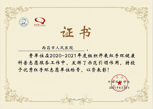 热烈祝贺西昌市人民医院再获年度优秀红手环志愿单位