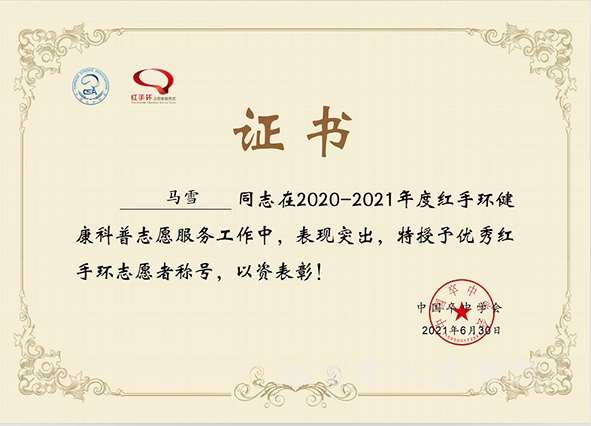 马雪荣获优秀红手环志愿者