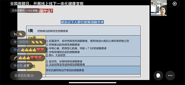 活动当日16:00,在西昌市人民医院心血管内科“冠心关爱群”、“支架人生群”里,直播老师郑淑娇讲解了什么是房颤?房颤的筛查,房颤的危害,房颤的预防及治疗等房颤相关知识,大家认真聆听讲解,并在微信群里向直播老师提问,群管理者和医护人员认真为大家作解答,线上线下参与的患者及家属纷纷点赞评论,深感受益匪浅。