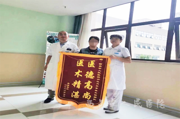 据消化内科主任黄林介绍,患者蒋某,因体检肠镜发现横结肠结节样肿物到我科住院,完善相关检查后,诊断为结肠肿物和多发性结肠息肉,经会诊讨论和沟通,决定为其实施内镜黏膜下剥离术(ESD)和内镜黏膜下切除术(EMR),手术顺利完成,手术没有腹部切口,术后患者没有任何不适,第2天就下床活动,第五天出院。7月19日,已回归日常生活的患者将一面写有“医德高尚 医术精湛”的锦旗亲手送到消化内科黄林主任手中,以表达感激之情。