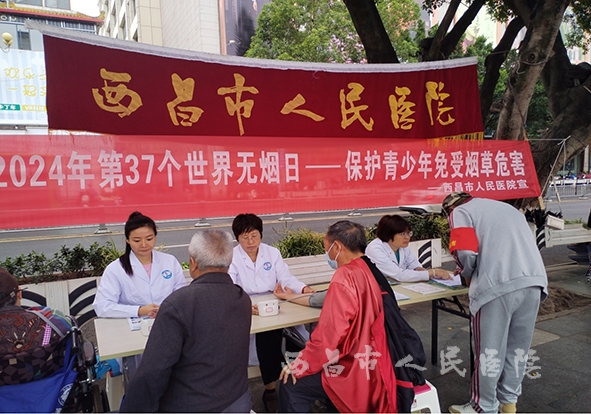 2024年5月31日是第37个世界无烟日,西昌市人民医院根据西昌市爱国卫生运动委员会和西昌市创建文明城市指挥部的要求,由公共卫生科积极组织了呼吸内科专家等相关医护人员,在月城广场参加”世界无烟日“主题宣传活动。