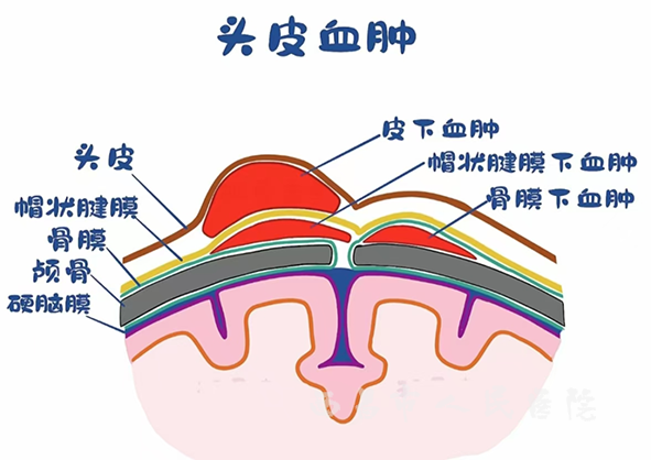头皮血肿定义:由于胎头下降过程中,受到产道挤压或产钳的使用等外伤原因或凝血功能障碍导致新生儿出现血管破裂,血液积聚于颅骨和骨膜之间而引起的局部包块,称为头皮血肿。